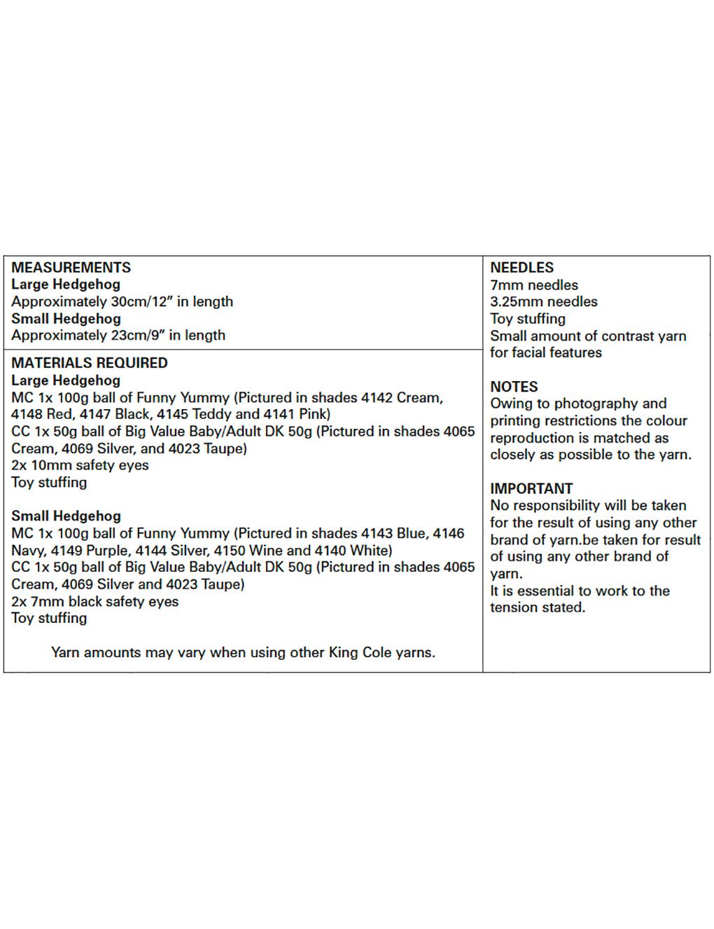 Yarn amounts may vary when using other King Cole yarns.