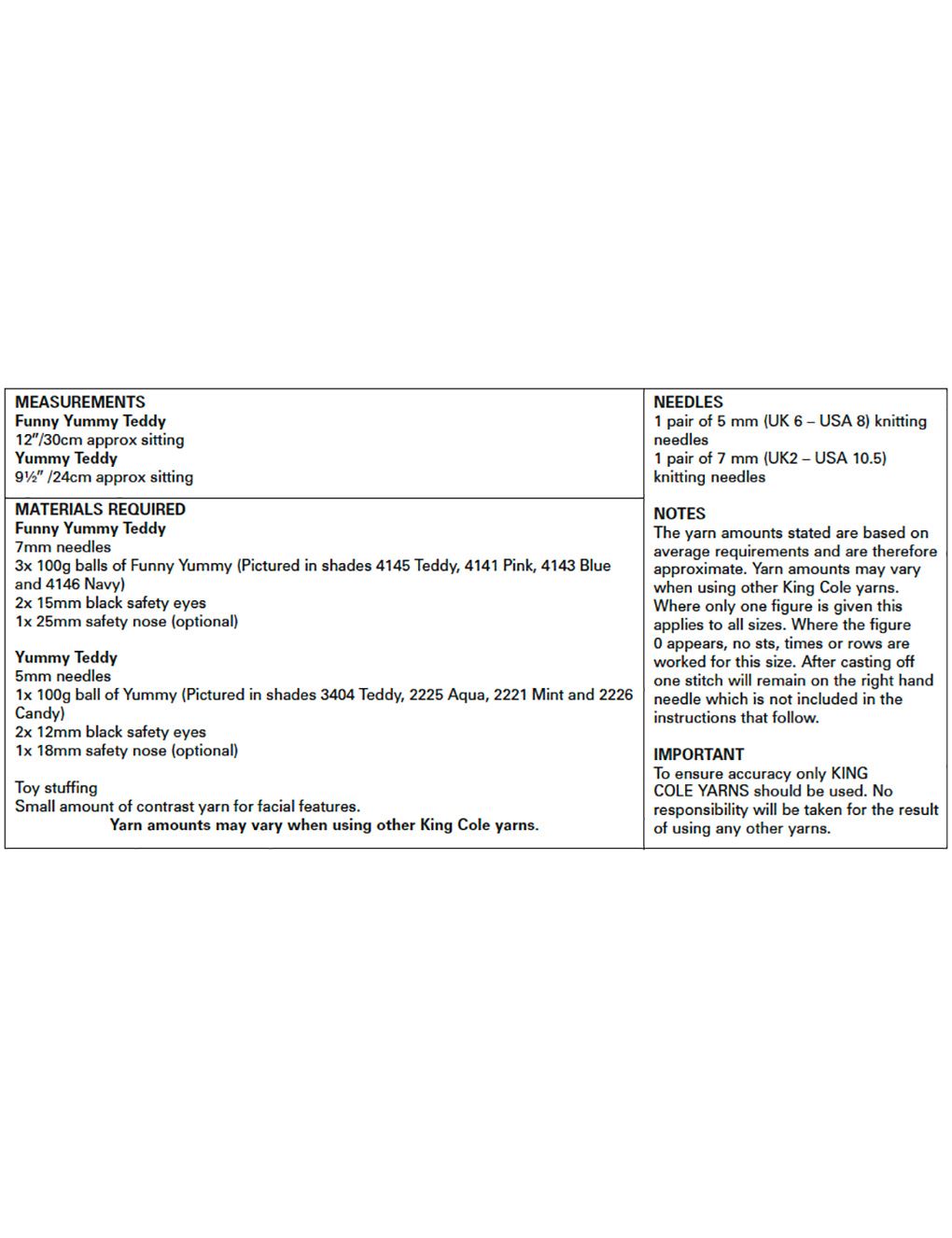 This pattern (9137) from King Cole will teach you to make teddies using super-soft and easy to use chenille yarn. A great chenille yarn project idea, the pattern will guide you through the process step by step - all you need is some knitting knowledge to start.