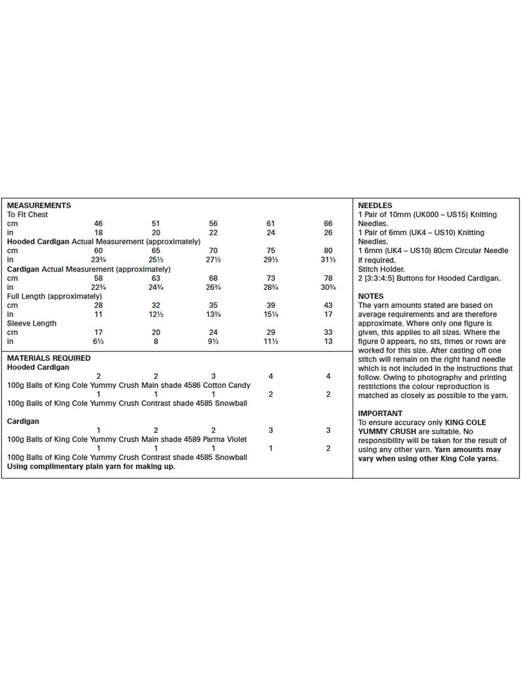 Yarn amounts may vary when using other King Cole yarns.